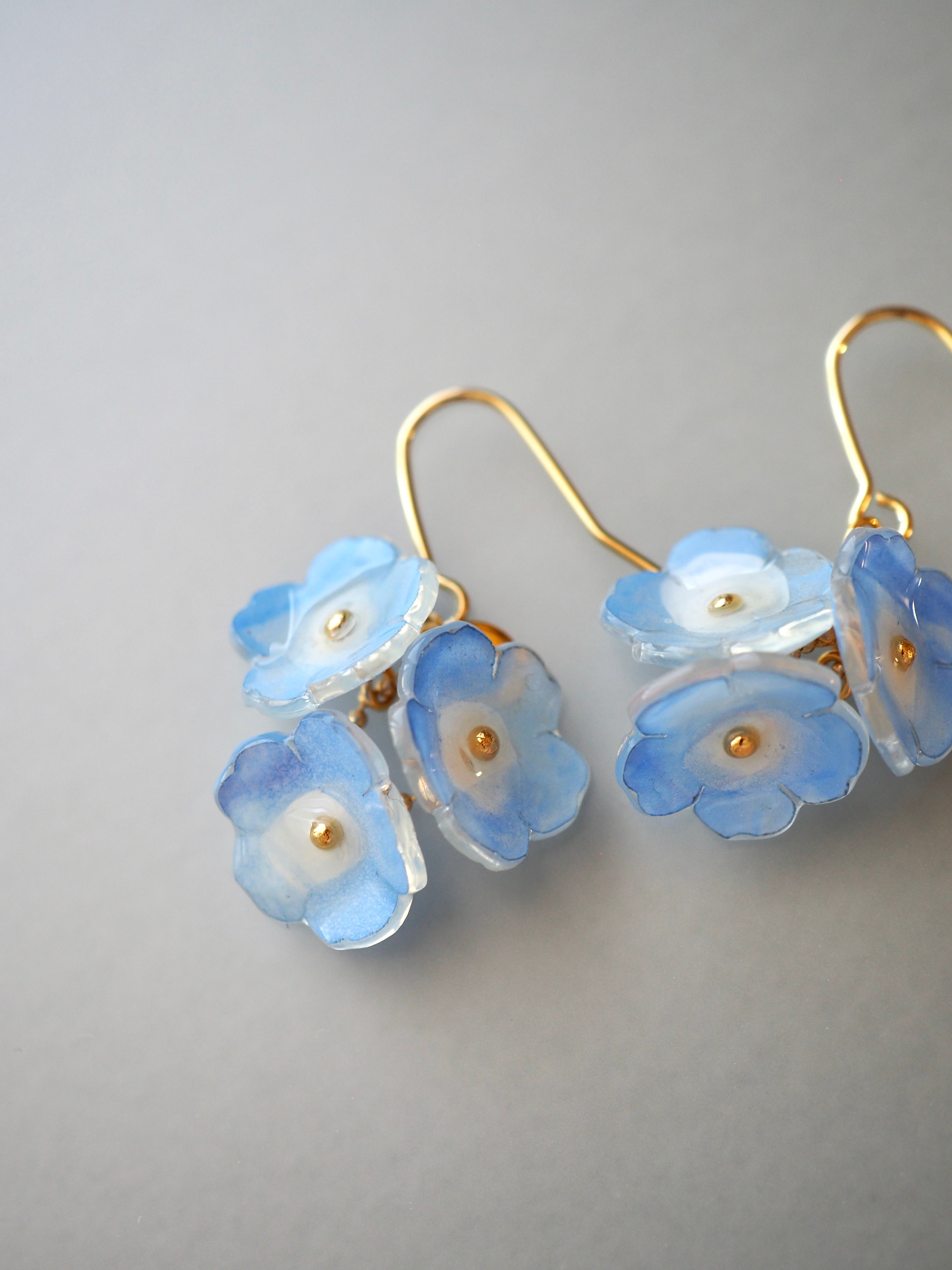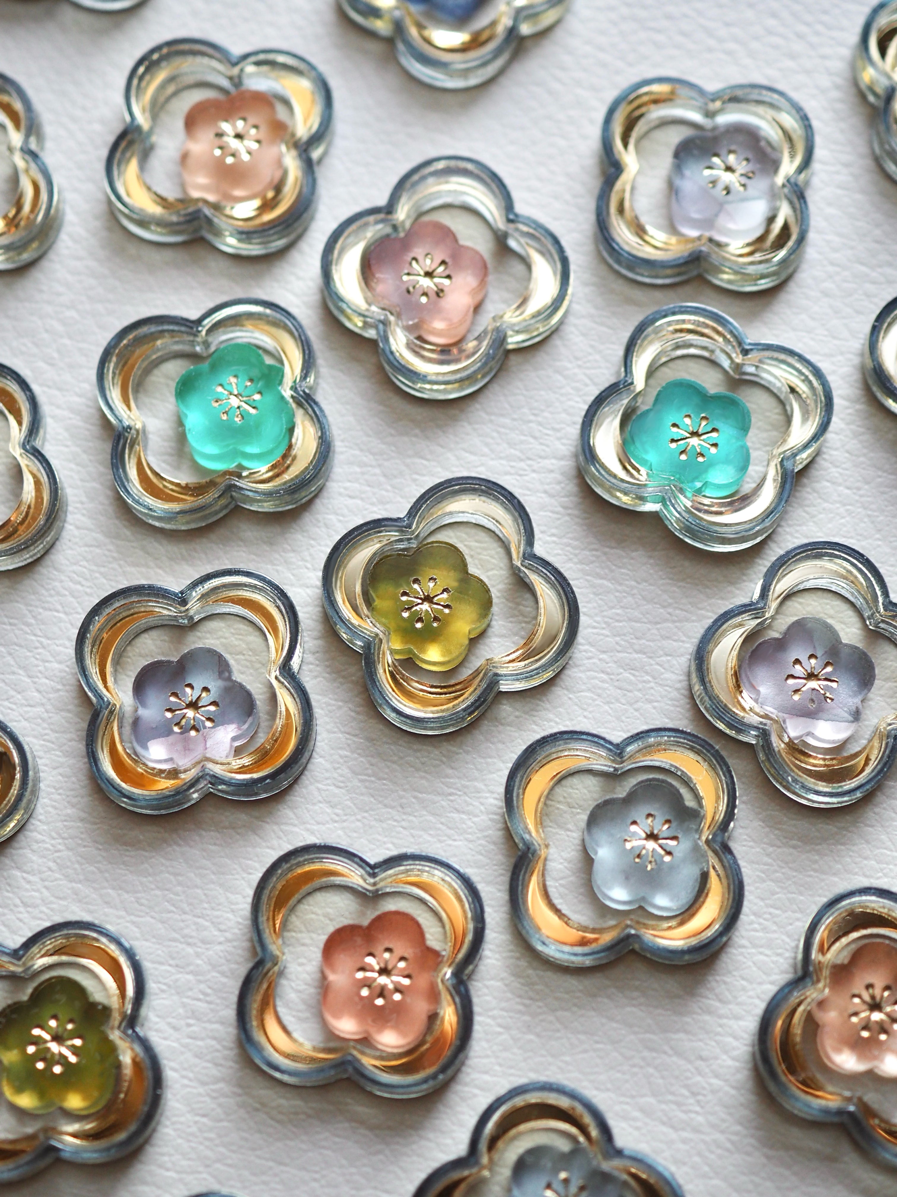 その中でも、私自身が筆で水彩を重ねたアクリルを使い、独自のデザインをもとに機械で一点ずつカットした、完全オリジナルのパーツを使用しています。
